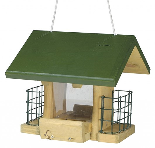 Het voederhuis is makkelijk te vullen door het dak op te tillen. Door het ophangkoord is het voederhuis op te hangen aan een tak of ophanghaak. Hang het voederhuisje goed zichtbaar vanuit het huis, dat verhoogt het kijkplezier!