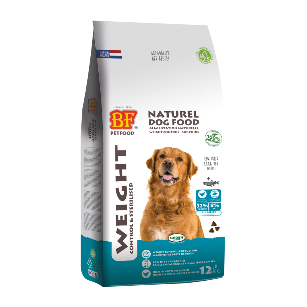 BF Petfood Weight Control & Sterilised is een volledige en zeer smaakvolle uitgebalanceerde voeding voor volwassen honden met overgewicht of met neiging tot gewichtstoename (bijv. bij sterilisatie). Met Weight Control & Sterilised formule: laag in calorieën en vetten, maar rijk aan eiwitten en vezels. Een hoog proteïne recept met kip met daarnaast zalmolie, glucosamine, chondroïtine, L-carnitine en vezelrijke granen met een lagere GI-index. Tarwevrij. Eiwitrijke voeding, zorgt dat het lichaam veel vet verbrandt in plaats van vetvrije lichaamsmassa voor het gewichtsverlies en helpt spierafbraak te voorkomen. Vezels zorgen voor een vol (verzadigd) gevoel, ondersteunen gewichtsverlies zonder dat de hond een honger gevoel heeft en ondersteund een gezonde stevige ontlasting. L-Carnitine stimuleert de verbranding van vetten en beschermt de spieren. Hoge acceptatie. Voor een optimale vertering en ontlasting en een goede conditie van jouw hond. Ondersteunt gewicht, mobiliteit, huid en vacht en de natuurlijke afweer. Voor volwassen honden.