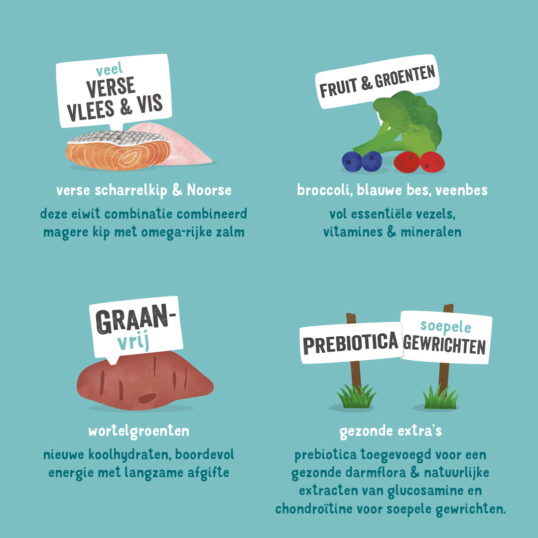 Samenstelling: verse kip 35%, bataten, erwten, verse zalm 5%, lijnzaad, erwteneiwit, kippensaus, mineralen, mannan-oligosachariden (MOS), fructo-oligosachariden (FOS), broccoli 0,04%, bosbessen 0,04%, vossenbessen 0,04%, cranberry's 0,04%, boerenkool 0,04%, maca 0,04%, goudsbloemblaadjes, brandnetel, braambesblaadjes, venkel, karwij, kamille, melisse, glucosamine, chondroïtinesulfaat.