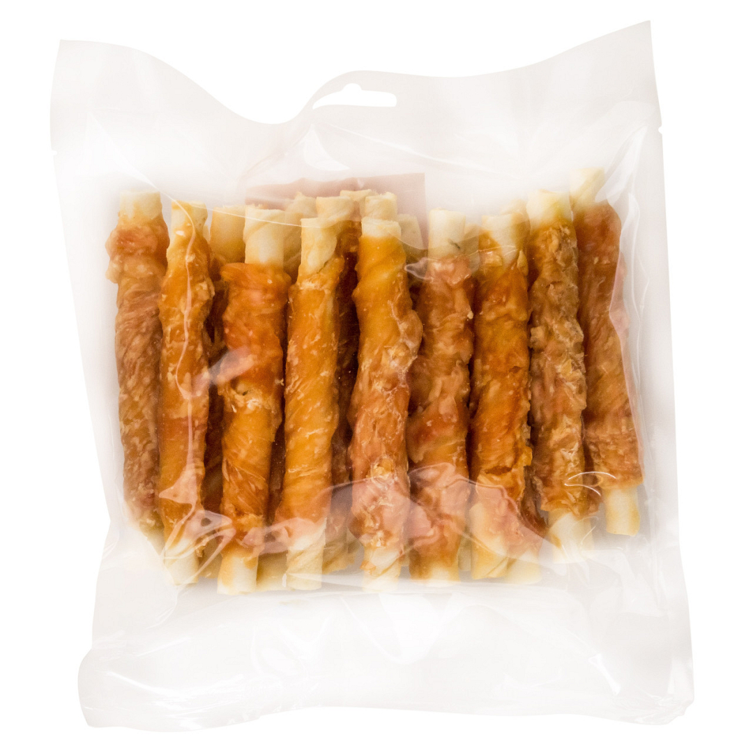 Glutenvrije kauwstaaf, omwikkeld met kip.