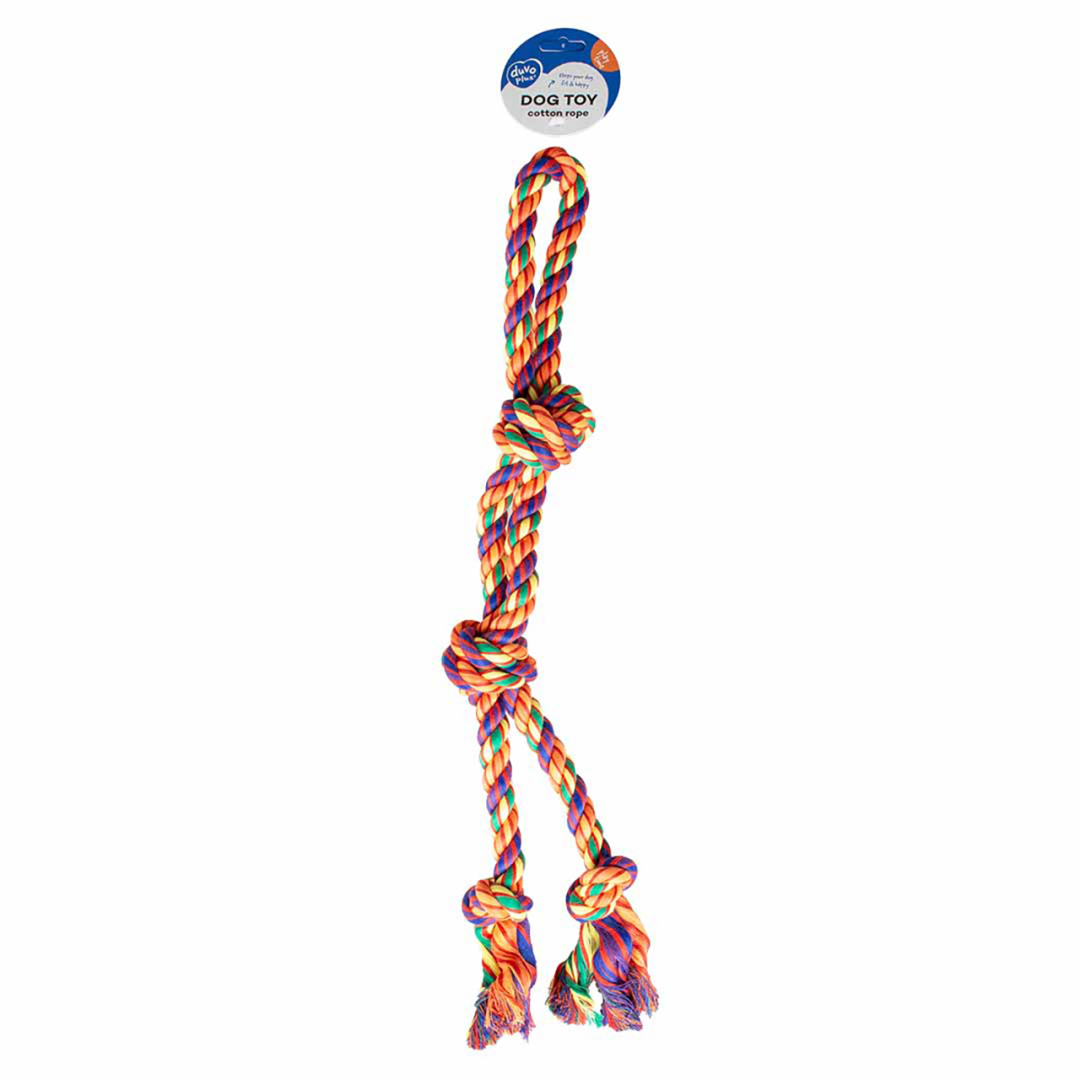 Dit kleurrijke touw van Duvo+ is speciaal ontworpen om jouw hond urenlang speelplezier te bieden. De knopen zorgen voor extra grip tijdens het trekken en spelen, terwijl het stevige materiaal ervoor zorgt dat het speeltje lang meegaat. Bovendien helpt het katoenen touw bij het schoonhouden van het gebit van je hond door de natuurlijke flossende werking van de vezels.