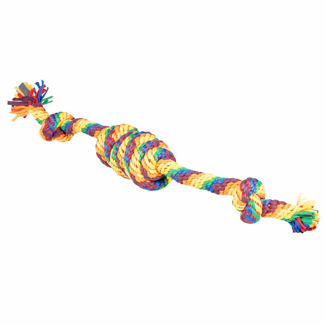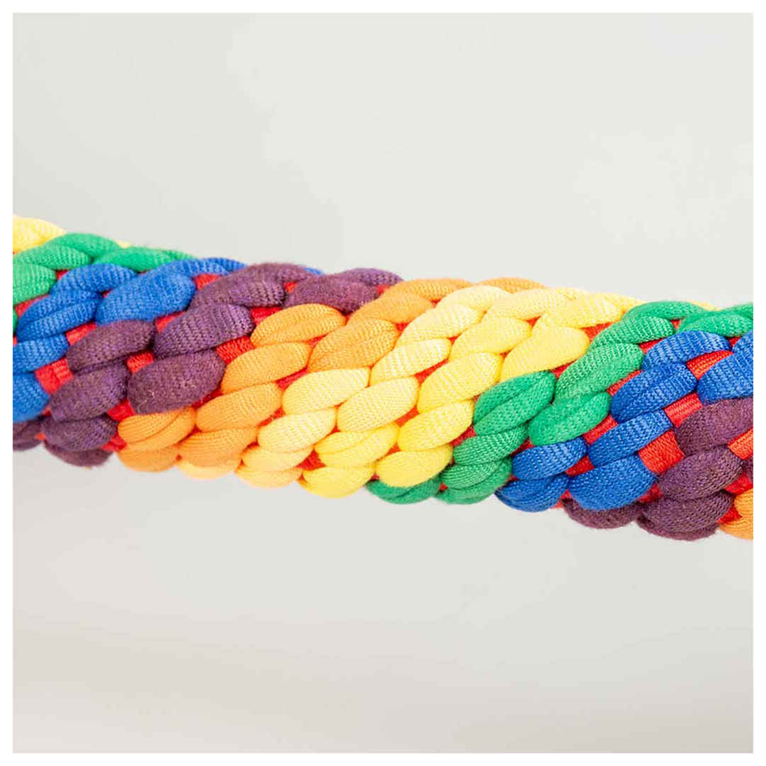Dit kleurrijke touw van Duvo+ is speciaal ontworpen om jouw hond urenlang speelplezier te bieden. De knopen zorgen voor extra grip tijdens het trekken en spelen, terwijl het stevige materiaal ervoor zorgt dat het speeltje lang meegaat. De T-shirtstof maakt het speeltje flexibel en zorgt voor een elastische rek tijdens het spelen.