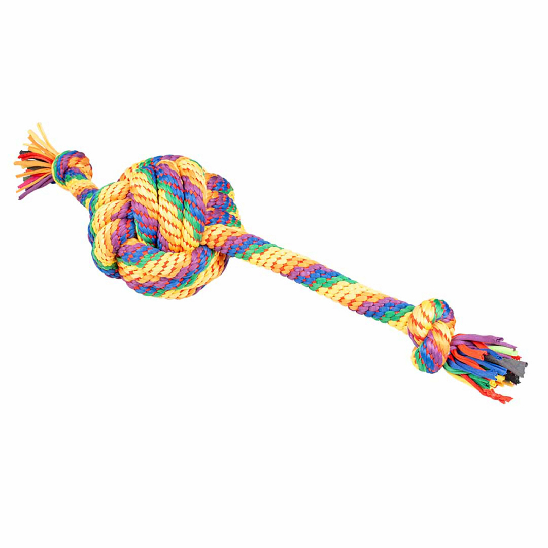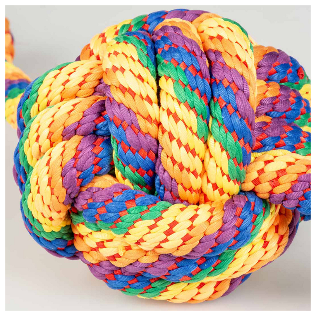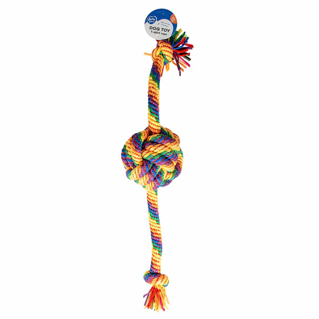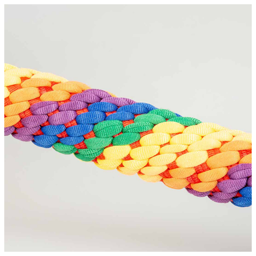 Dit kleurrijke touw van Duvo+ is speciaal ontworpen om jouw hond urenlang speelplezier te bieden. De knopen zorgen voor extra grip tijdens het trekken en spelen, terwijl het stevige materiaal ervoor zorgt dat het speeltje lang meegaat. De T-shirtstof maakt het speeltje flexibel en zorgt voor een elastische rek tijdens het spelen.