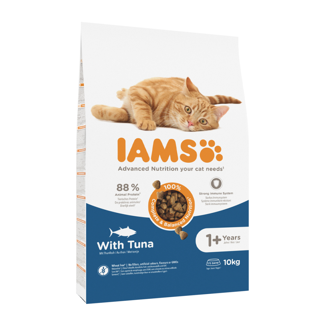 Samenstelling: gedroogde kip en kalkoen 39% (kip 24%, een natuurlijke bron van taurine), maïs, sorghum, varkensvet, gedroogde tonijn (4%), gedroogde bietenpulp (1.8%), kippenjus, fructo-oligosachariden (0.73%), visolie, kaliumchloride.