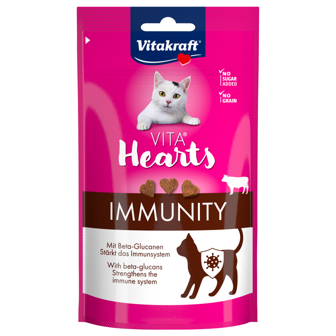 Vitakraft Hearts Immunity met rundvlees smaakt niet alleen heerlijk, maar versterkt ook het immuunsysteem dankzij de toevoeging van bètaglucanen.