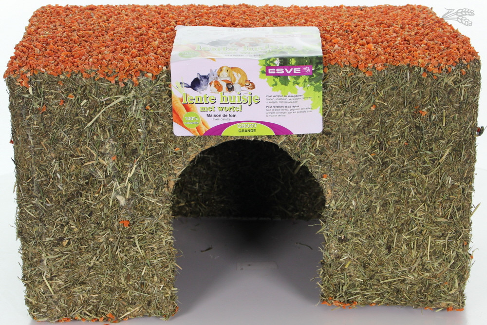 De huisjes zijn gemaakt van natuurlijke materialen en zorgen ervoor dat uw konijn of knaagdier zich niet meer hoeft te vervelen. Het huis is bedekt met graszaden, hooi en een dak van wortel.