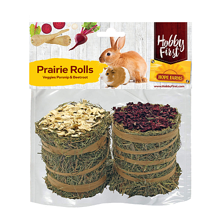 HobbyFirst Hope Farms Prairie rolls veggies is een aanvullend voeder voor konijnen en knaagdieren. Fris geurend hooi met een heerlijke topping van pastinaak en rode biet.Het bevat veel vezels en het is zowel lekker als gezond.