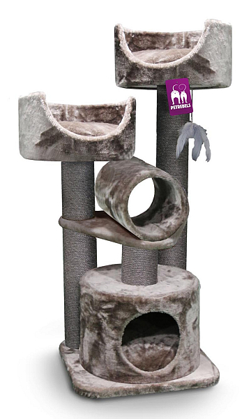 Compacte en sterke krabpaal met 12 cm dikke stammen, 2 divans met uitneembaar kussen, slaapruimte en een speelrol.